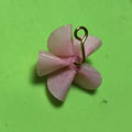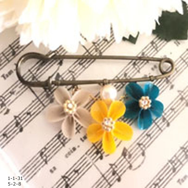 - Tピンにラインストーンを貼り、メタルパーツ+花パーツの順で入れ後ろをL字に曲げてから丸くする。