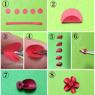 - ドットを②~④の様に折る(②ポイント1/3折り、③④花びらの部分は折り目を付けない)。