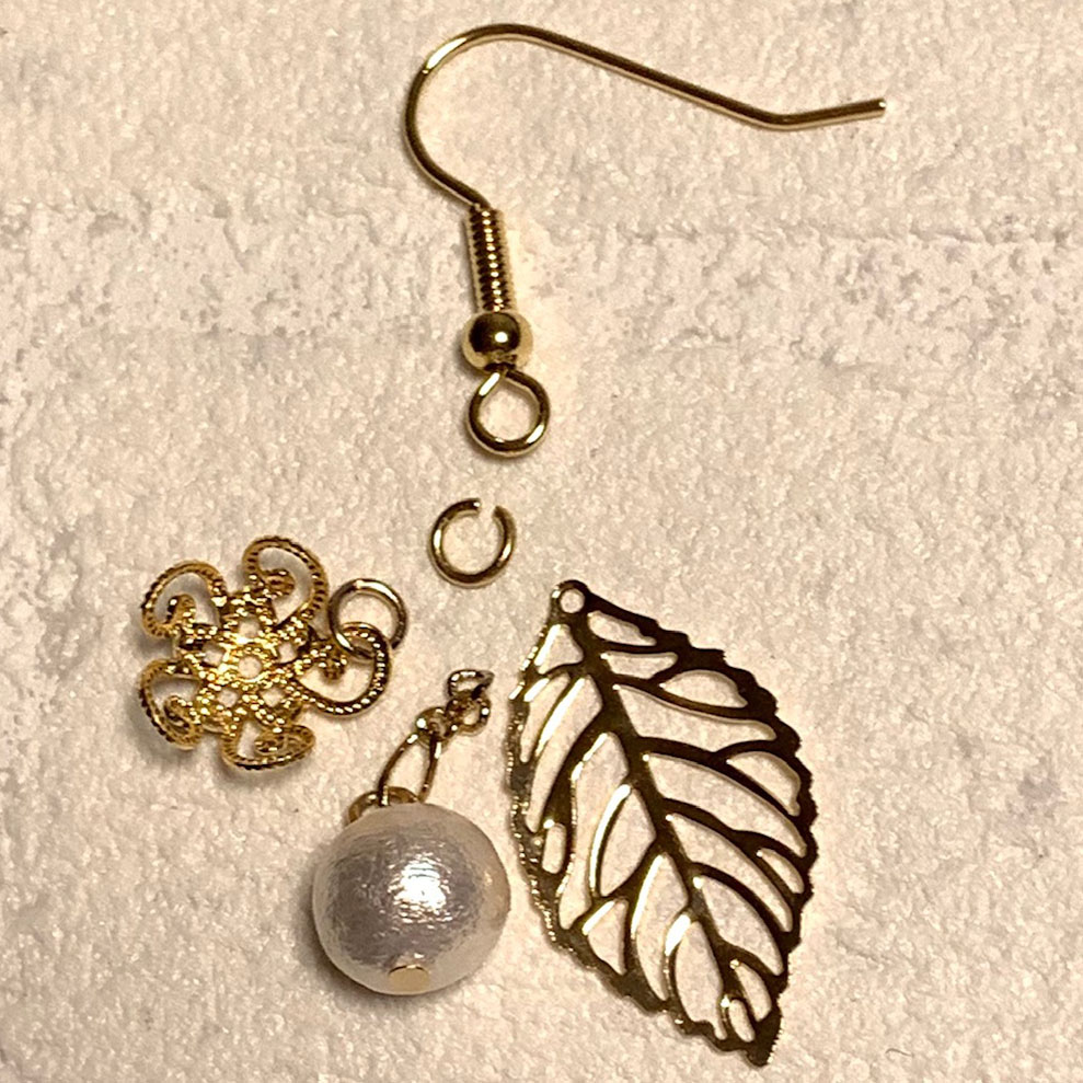 - イヤリング(ピアス)金具に丸カンでパーツをつなぐ。下からリーフ、パール、座金の順で組み立てる。