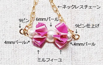 - 9ピンに4mmパール→ミルフィーユ→6mmパール→ミルフィーユ→4mmパール→