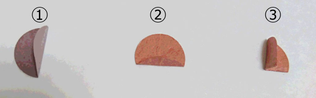 1. ドットを半分に折り、折り目が縦になるようにして、下から1/3のところを折る(図-①、②)。