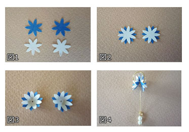1. 花びら2枚をずらして重ね、のりで貼る(図1、2)。