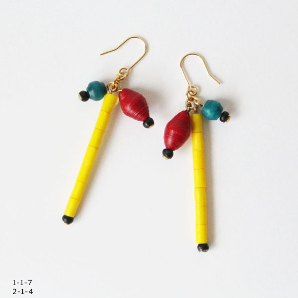 - 丸カンに作った3種類のペーパービーズを入れ、ピアスやイヤリングなどに仕上げる。