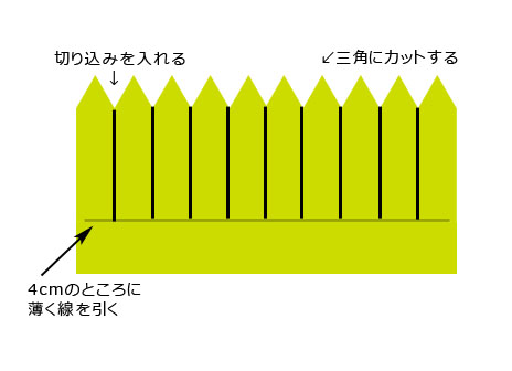 - 花びらは、ラインペーパー10mmに、4mmのところに薄く線を引き、線を引いた長い方に切り込みを入れ、先を三角にカットする(図1)。