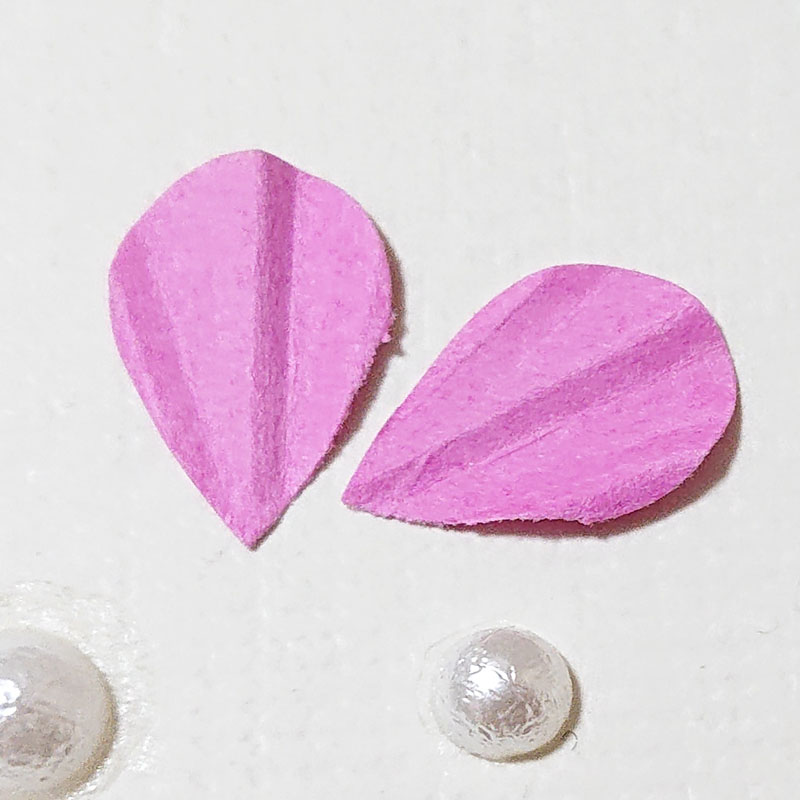 真ん中・右・左の3ヵ所(写真1)。 - 1 にしずくを貼り付け、1に沿って丸く形をつける(写真2)。