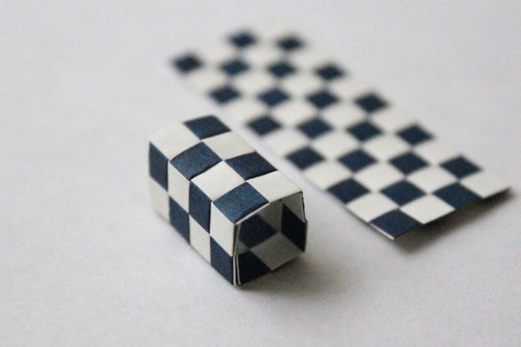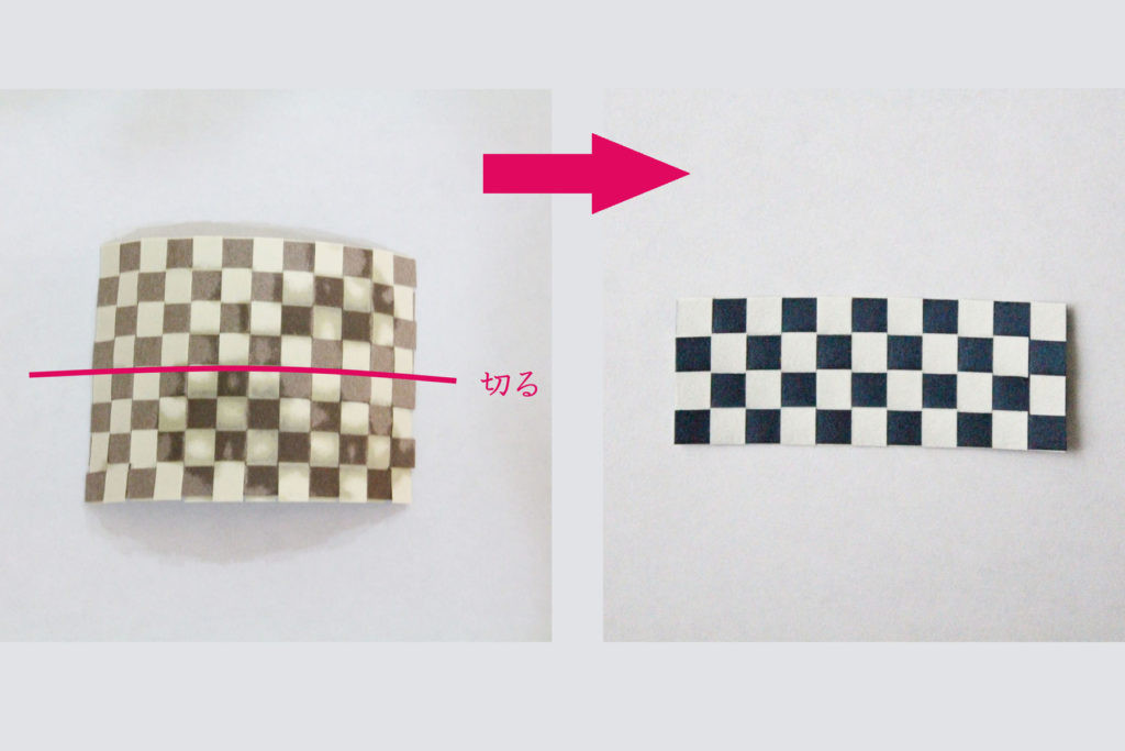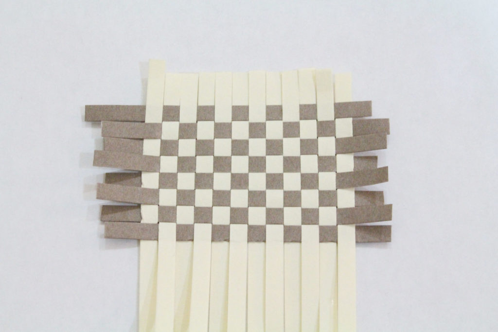 - ラインペーパー4mmをウィーブの手順で、毎回爪楊枝で少量のボンドをつけながら、隙間のないチェック柄を作る。(横12枚、縦8枚)<写真1>