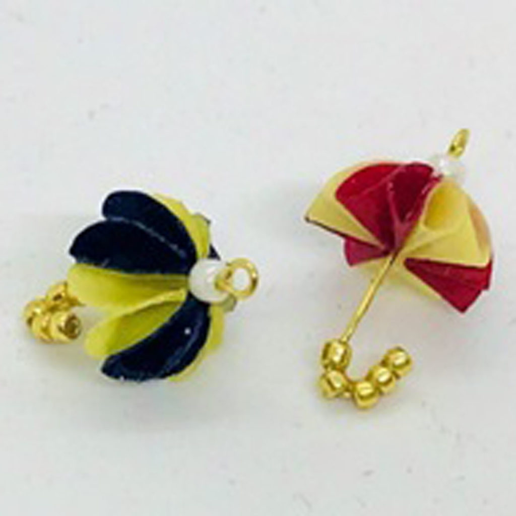 - 4分の1に折った状態のドット6枚の外側にボンドをつけ、中心に白ビーズを通した9ピンを挟み、一周張り合わせる。