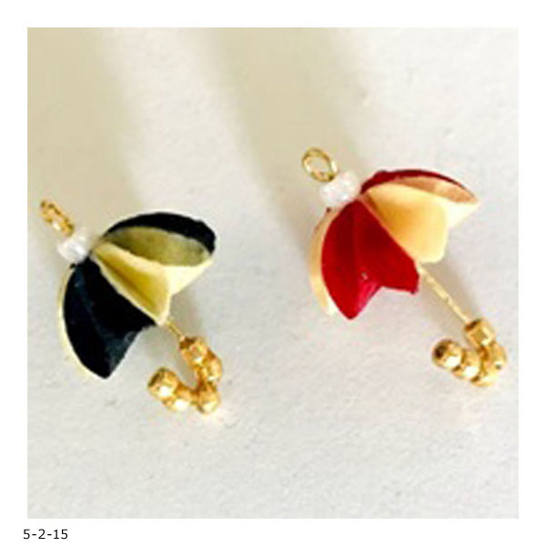 - 9ピンの丸めた部分に金ビーズ5個を通し、レジン液を塗りライトを当てる。