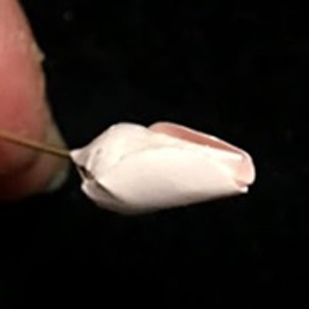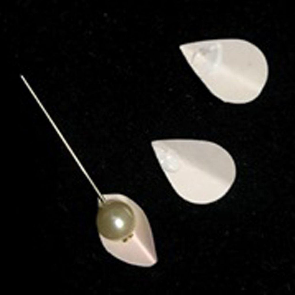 - しずく3枚を半分に折り、尖った方にボンドをつけ、Tピンにさしたパールに巻きつける。(写真1)しずくの丸みのある方の半分に、折った部分が重なりあるようにする。(写真2)