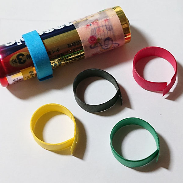 1. ラインペーパー各色の4.5cm2枚を貼り合わせ、その上に5cmのペーパーを貼り付け、単3電池に巻き付けて形を作る。(写真1,2)