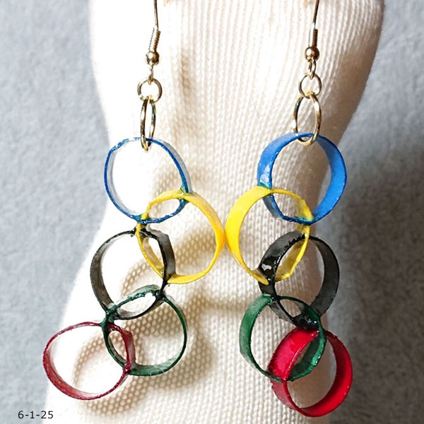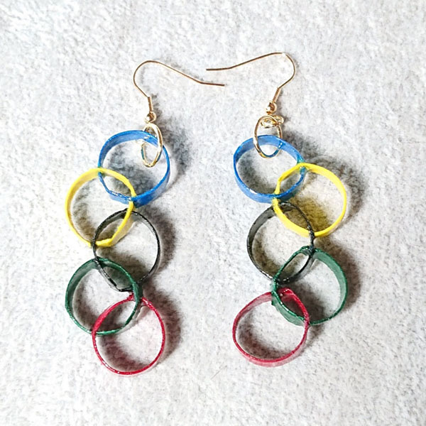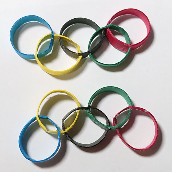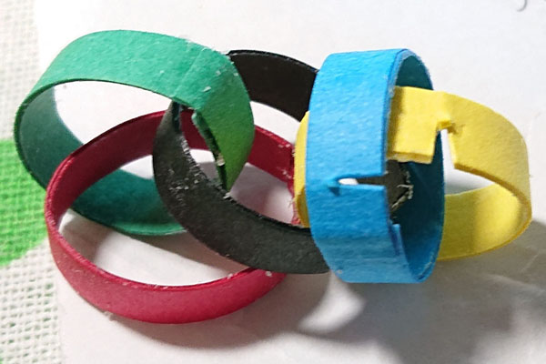 2. 青・黄・黒・緑・赤の順で鎖繋ぎにする。(写真3)