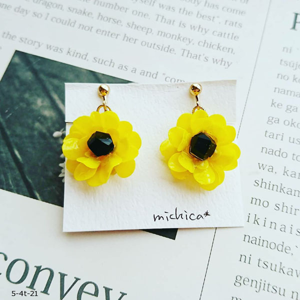 6. 花の中心に黒いグラスビーズを付ける。さらに、ひまわりのお花の裏に座金を付け、丸カンやイヤリング・ピアスの金具を付けて完成。