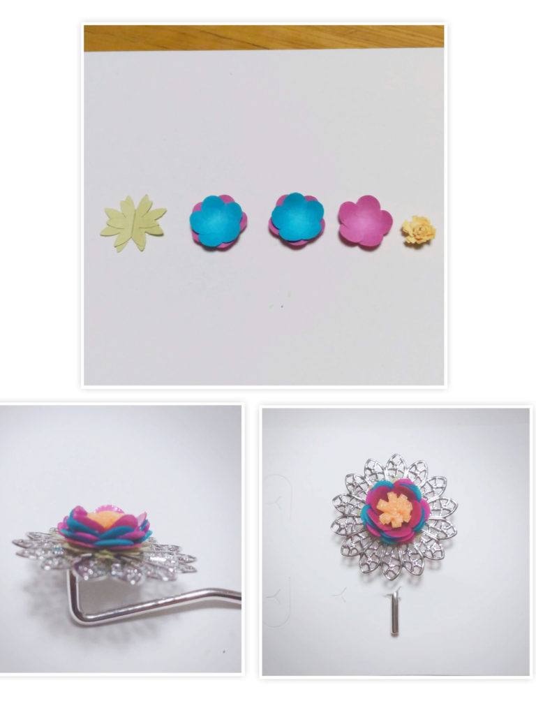 - マノンに切り込みを入れて丸みを付け、重ね合わせ花の形にする。