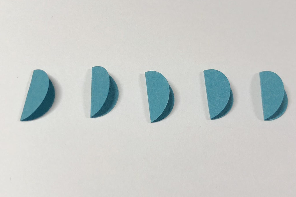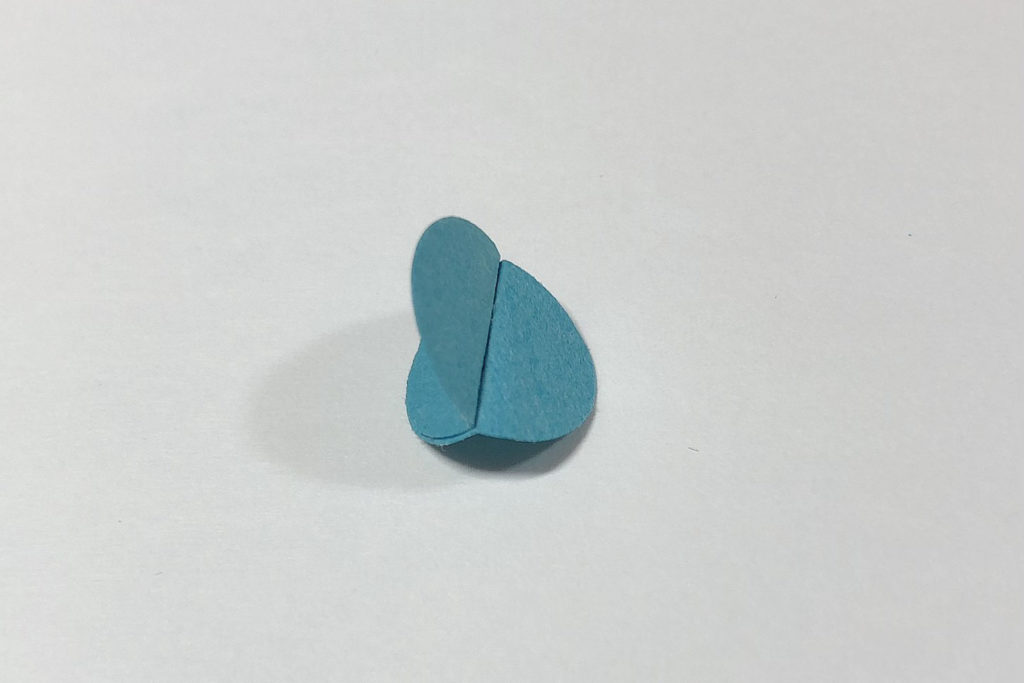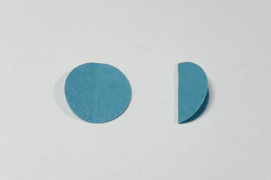 - 半分に折ったドットの片面にのりを少しつけ、半分に折ったのを貼り合わせる。(写真3)