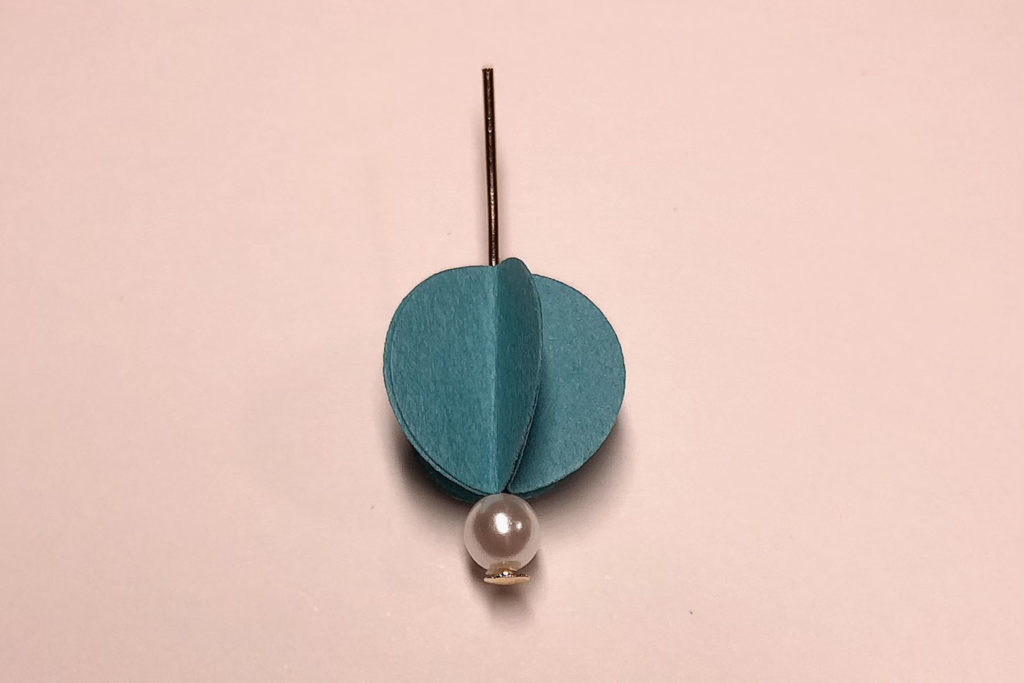 - 4枚貼り合わせたら、真ん中にボンドを付け、スワロパールを入れたTピンを貼り付ける。
