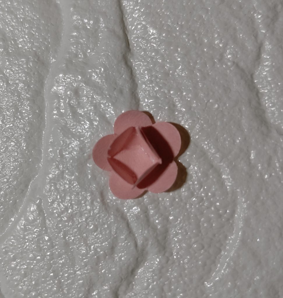 - 花びらに少しウェーブを入れて下を少しカットし、2に貼り付ける。