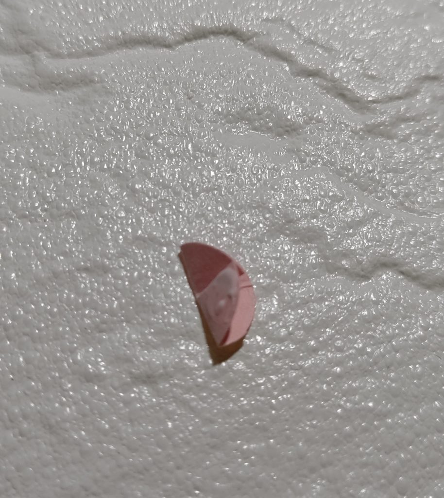 - ドットを4つ折りにして一か所切り込みを入れ、切り込みを入れたところ同士を糊付けする。(写真2)