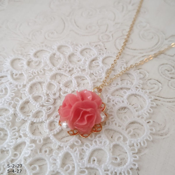 - 座金にビーズと花を糊付けしてレジンで固め、ネックレスを付ける。
