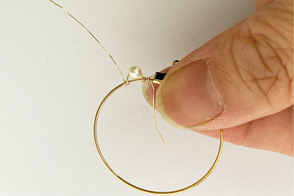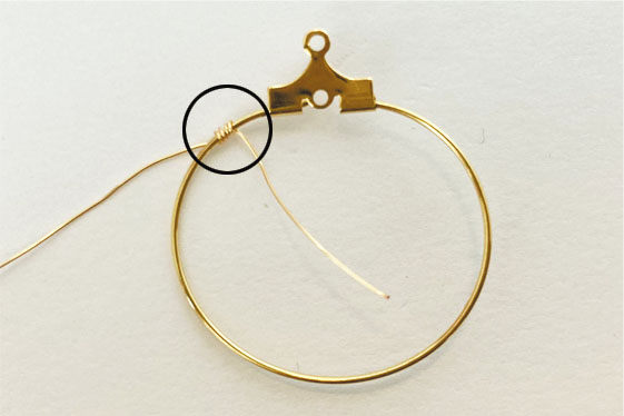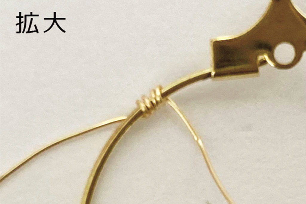 2. 樹脂パールを通して、ワイヤーが緩まないようフープに2~3回巻きつける。(写真3)