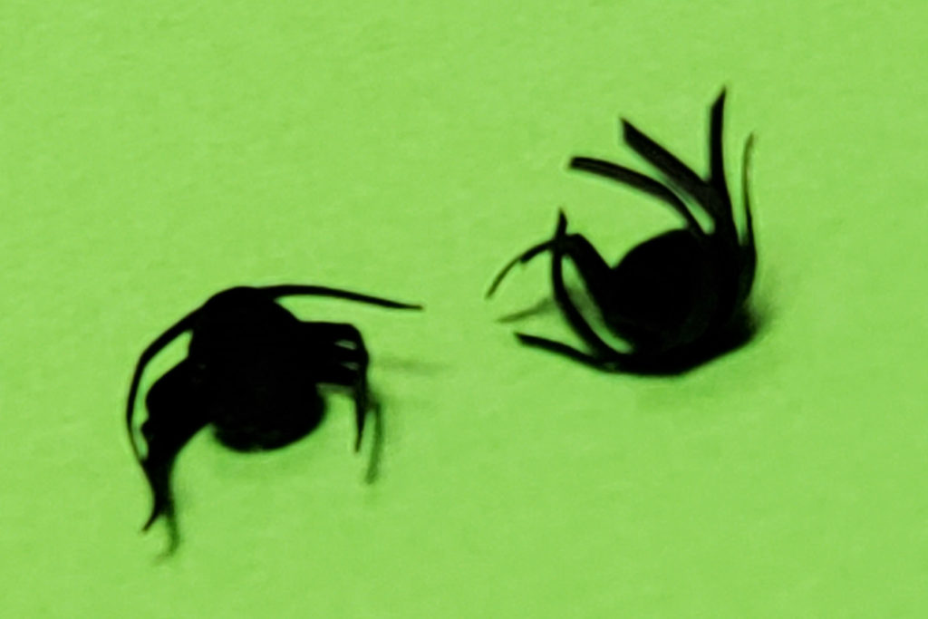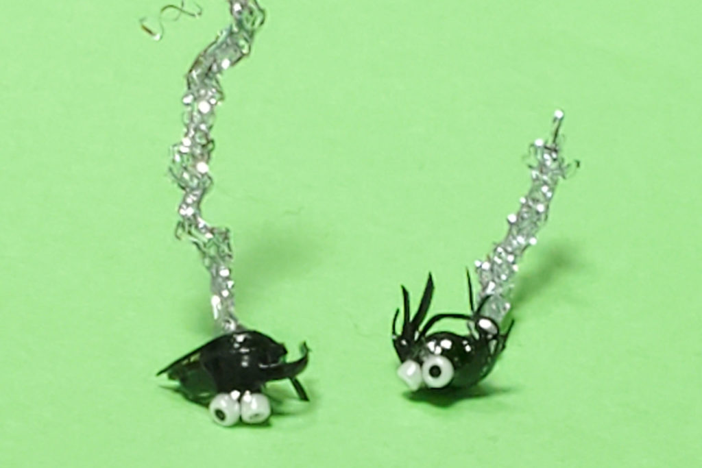 11. 10に糸(紐留めを付ける)と小ビーズ2個をつけクモを作りコーティングする(クモ本体の中心に目打ちで糸を押し込み、レジンコーティング)。(画像6)