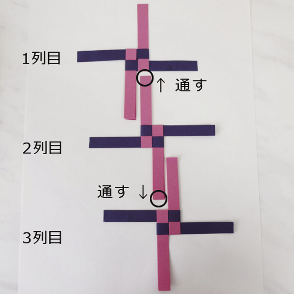 - ペーパーを1マスずらす形で並べ、2列目の上下に出ているペーパーを1列目と3列目に通し、組んでいく。(画像1)