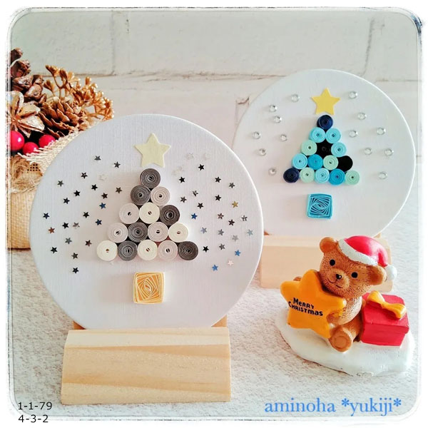 印を付けたところで貼り合わせ、円を潰して四角形にして台紙に貼る。 - ツリーのテッペンにスターを貼り、周りをビーズやシールで飾る。