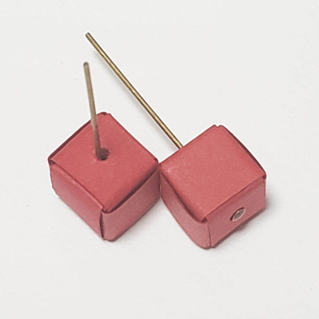 - キューブの面の真ん中に目打ちで穴を開け、Tピンを通しピンワーク。(写真1)