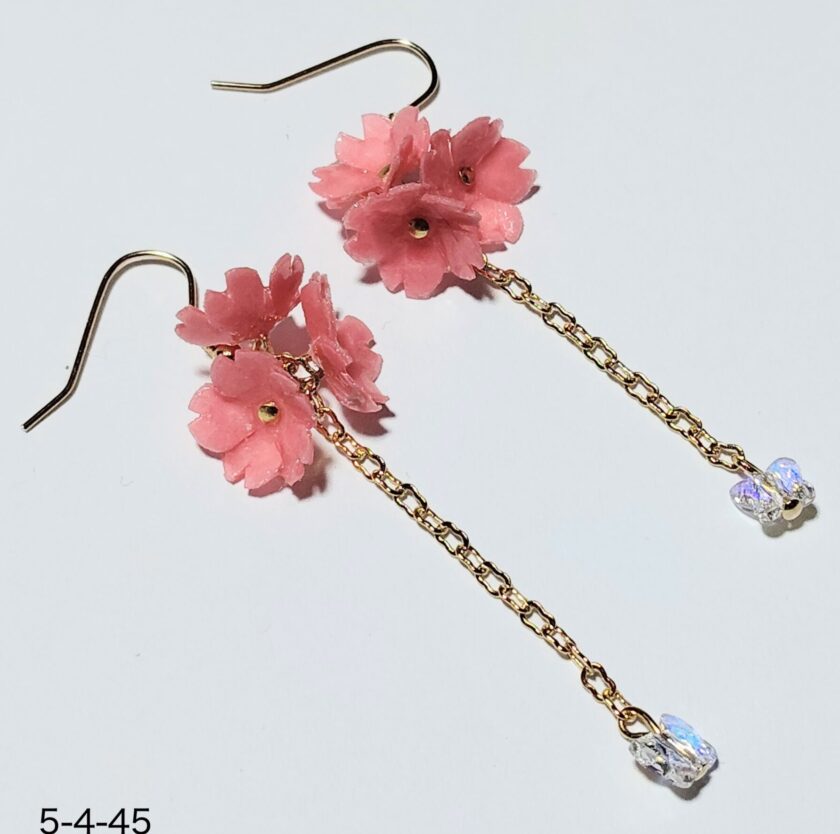 - 花を3つずつチェーンにつけてイヤリングかピアス金具をつけて完成させる