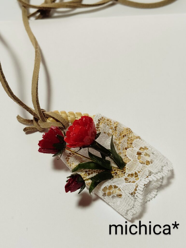 - 花の中心から下へTピンを通し作った葉っぱをつけてお好きなものに固定してネックレスとして仕上げます。