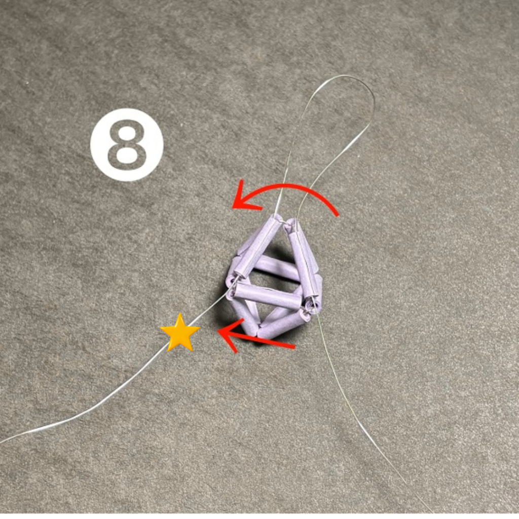 8.最初の三角形にワイヤーをそれぞれ通し、余ったワイヤーを通していないプチロールに通しながら ★の位置に2本のワイヤーを集める。(写真⑧⑨)最後に眼鏡止めをし完成。*形を整えながら締めていくと安定します。