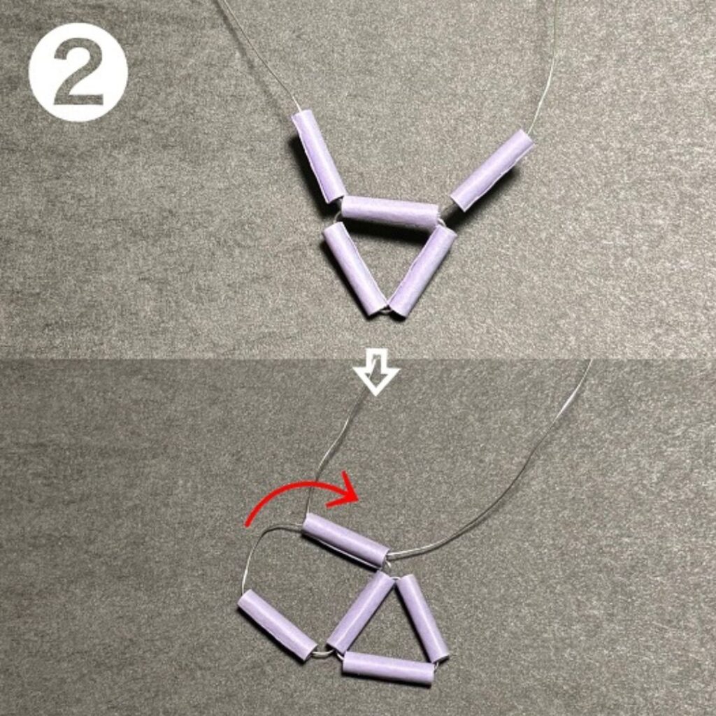 右側のプチロールに左のワイヤーを通してもう一つ三角形を作る。(写真②)