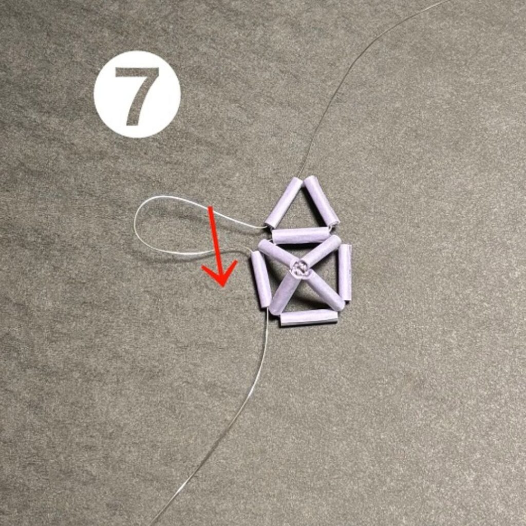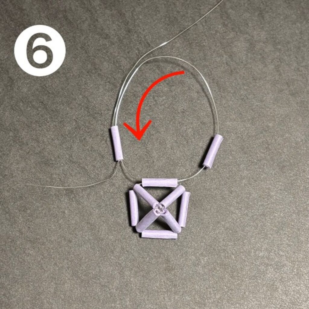 6.左のワイヤーを写真⑦のように通す。右のワイヤーにプチロールを1個通し、ワイヤーを交差させる。