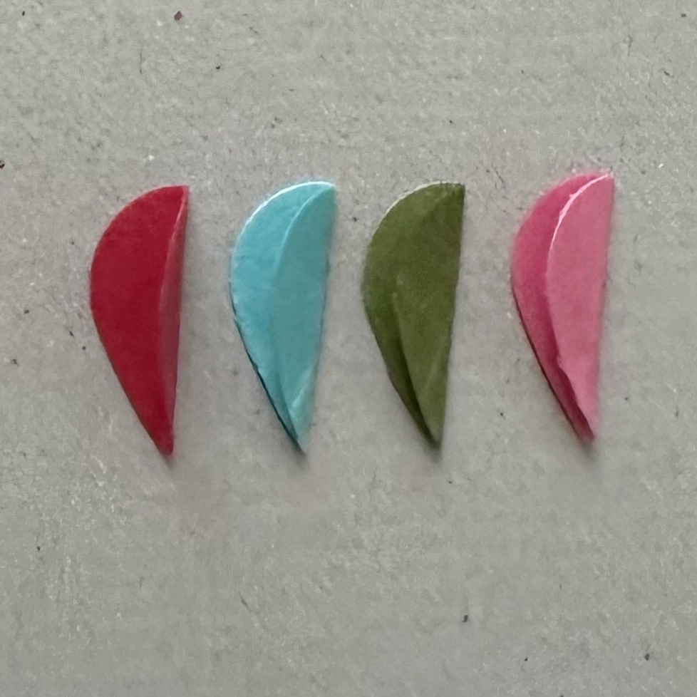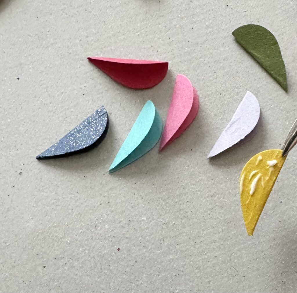 3.しずくを7枚貼り合わせ最後の面を閉じる時、プチロールを通してあるピンを挟みこみボンドで固定しながら閉じ、9ピン仕上げにする。