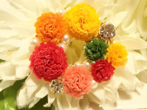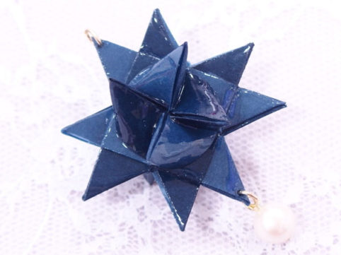 作品使用ペーパーNO.53 NO.114 NO.137 材料 ラインペーパー 13mm ロンデル 6mmスワロパール 4mm菊座 4mmTピン 30mm 作り方 パンチで3色各4枚抜く。 1を3色各2枚(6枚)で組む(2...