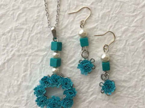 作品使用ペーパーNO.78 材料 ラインペーパー4mm 1/2 1/4パール天然石ターコイズネックレスチェーンピアスまたはイヤリングリース風のパーツピアスに合う台座 作り方 作品紹介 フリンジでブルーの可愛いお花のリース...