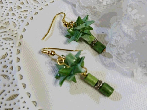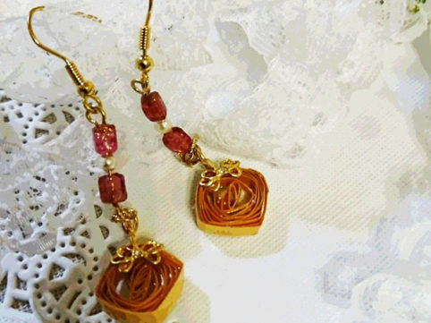 作品使用ペーパーNO.60 材料 ラインペーパー4mm 2色使いを2つラインペーパー4mmで1/4を4つTピン 2本イヤリングORピアス 作り方 ペーパー4mmを2種類でスターフラワーを2つ作る。 1/4サイズでプチロー...