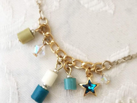 作品使用ペーパー(左から)NO.61 NO.01 NO.76 NO.78 材料 ラインペーパー5mm 1/3スワロビーズ4mm 2個Tピン 5個小ビーズ 5個丸カン 6個好きなチャーム 1個メタルチェーンパーツG30mm...