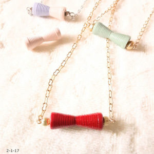 材料 三角ペーパー 2本ハトメ メタルビーズ チェーン ネックレス(全体の長さ約40cm) 作り方 片側を1~2周巻く。左側をバーの下から右側の紙に、少し重ねて差し込む。(写真1) しばらく同時に巻く。(写真2) 分かれ...