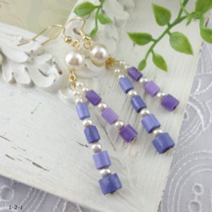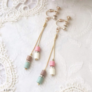 作品使用ペーパー(左から)NO.59 NO.23 NO.02 NO.47 材料 ラインペーパー5㎜ 長さ1/3 4個×2 チェーン 4㎝×2 5㎝×2 カシメ 2個 丸カン 2個 つぶし玉 4個×2 ロンデル 2個×2 ...